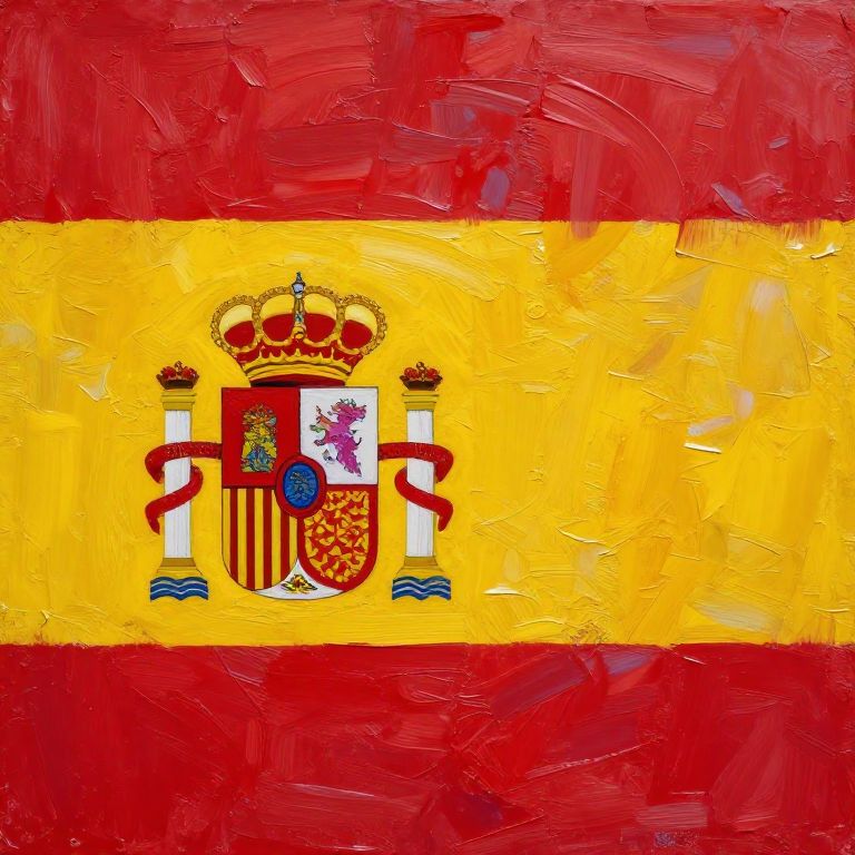 This digital image depicts the flag of Spain, painted in a thick, textured, brushstroke style. The flag features three horizontal stripes: red at the top and bottom, and a wide yellow stripe in the center. In the yellow stripe, there is the Spanish coat of arms, which includes a red crown, a shield with a vertical yellow stripe, a red lion, and a blue scroll, surrounded by white columns and blue waves. The vibrant colors and textured brushstrokes give the flag a dynamic, painterly feel. The image is brightly lit, emphasizing the bold colors and detailed textures of the paint.