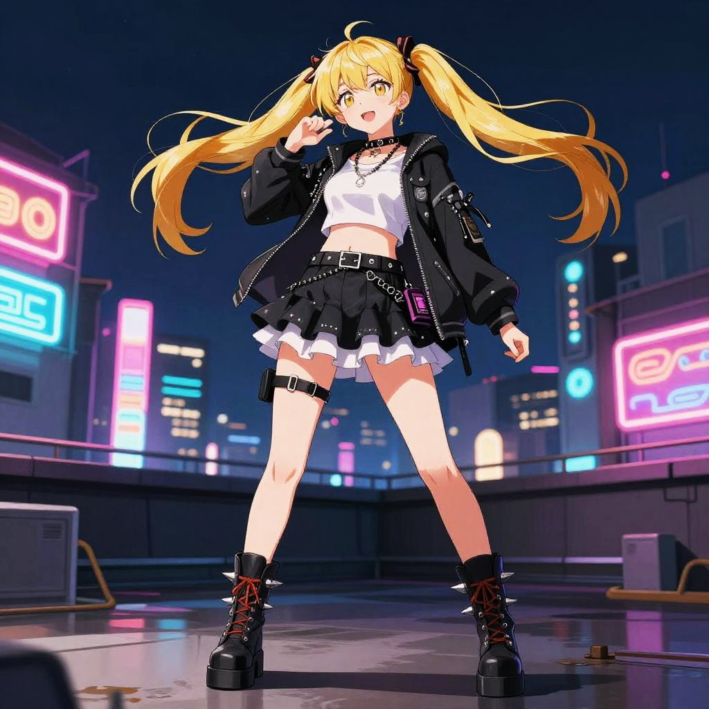 Misa Amane full body portrait in a stylish punk rock outfit, spiked boots and layered skirts, bright blonde twin tails swaying, dynamic pose on an urban rooftop with neon signs, nighttime ambiance, highly detailed anime art with vivid colors