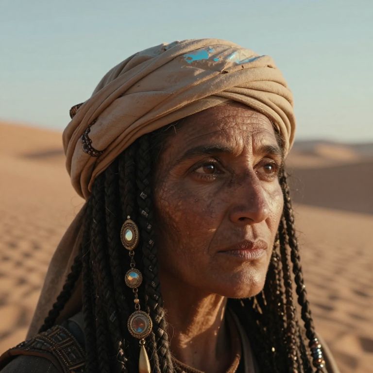 A portrait capturing an ancient mystic's visage in photorealistic detail, her deep-set eyes reflecting wisdom and her weathered skin telling tales of desert suns past. Her braided hair is adorned with shimmering amulets, mirroring the textured sand dunes stretching to the horizon. The scene is viewed from a unique perspective, just above her turban's crown, which echoes these distant landscapes. A dramatic angled light illuminates her face, casting long shadows and emphasizing the rugged terrain of her features, as she gazes into the distance with an expression that combines knowledge, contemplation, and an enigmatic sense of destiny, evoking both awe and trepidation in equal measure.