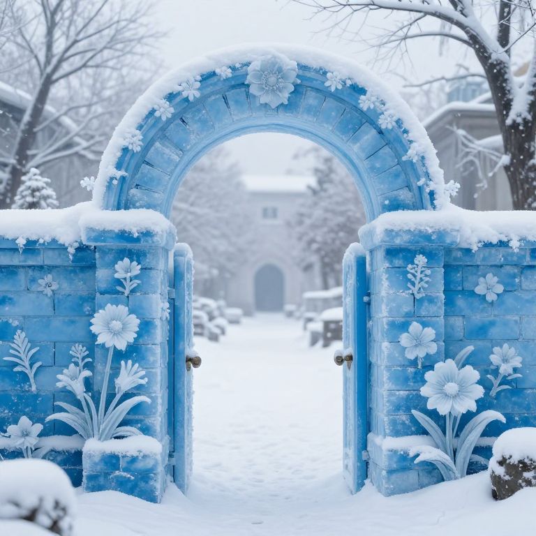 A whimsical archway crafted from frosty blue bricks and adorned with delicate floral ice sculptures invites passage into a realm where winter's breath transforms the ordinary into the enchanting.