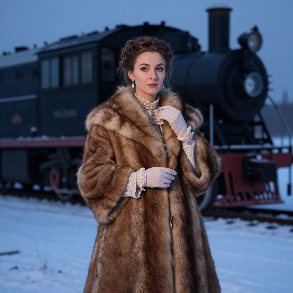 A beautifully dressed woman in 1860 Russian fashion, wearing an elegant fur coat, stands in a wintry, twilight atmosphere, with soft cold lighting and a vintage locomotive in the background.