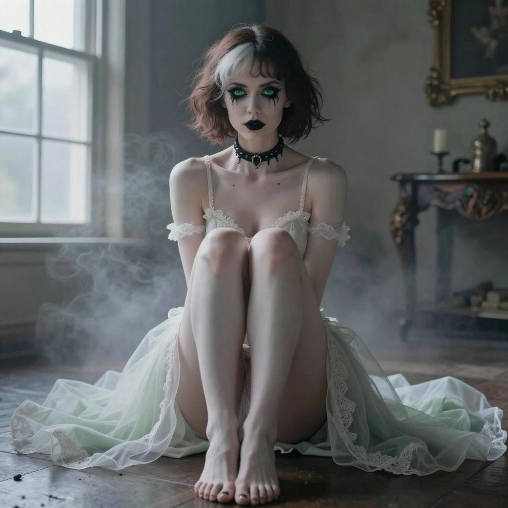 ((best quality)), (ultra-detailed:1.05), (high resolution:1.05), (sweet and beautiful:1.1025), (extremely detailed face:1.1025), (realistic eyes|detailed eyes), (eyelashes:1.2-4), (lingerie|wedding dress), 1girl, (Anna-Marie Darkholme from X-Men:1.2), (X-Men Evolution:1.2), X-Men Rogue, gothic makeup, goth, choker, pale skin, X-Men, Marvel, superhero, green eyes, brown hair, (white bangs:1.2), short hair, athletic body, full body, detailed toes, explicit, diffused lighting, seductive, misty, steam, floating light particles, window, early dawn, green sheer fabric