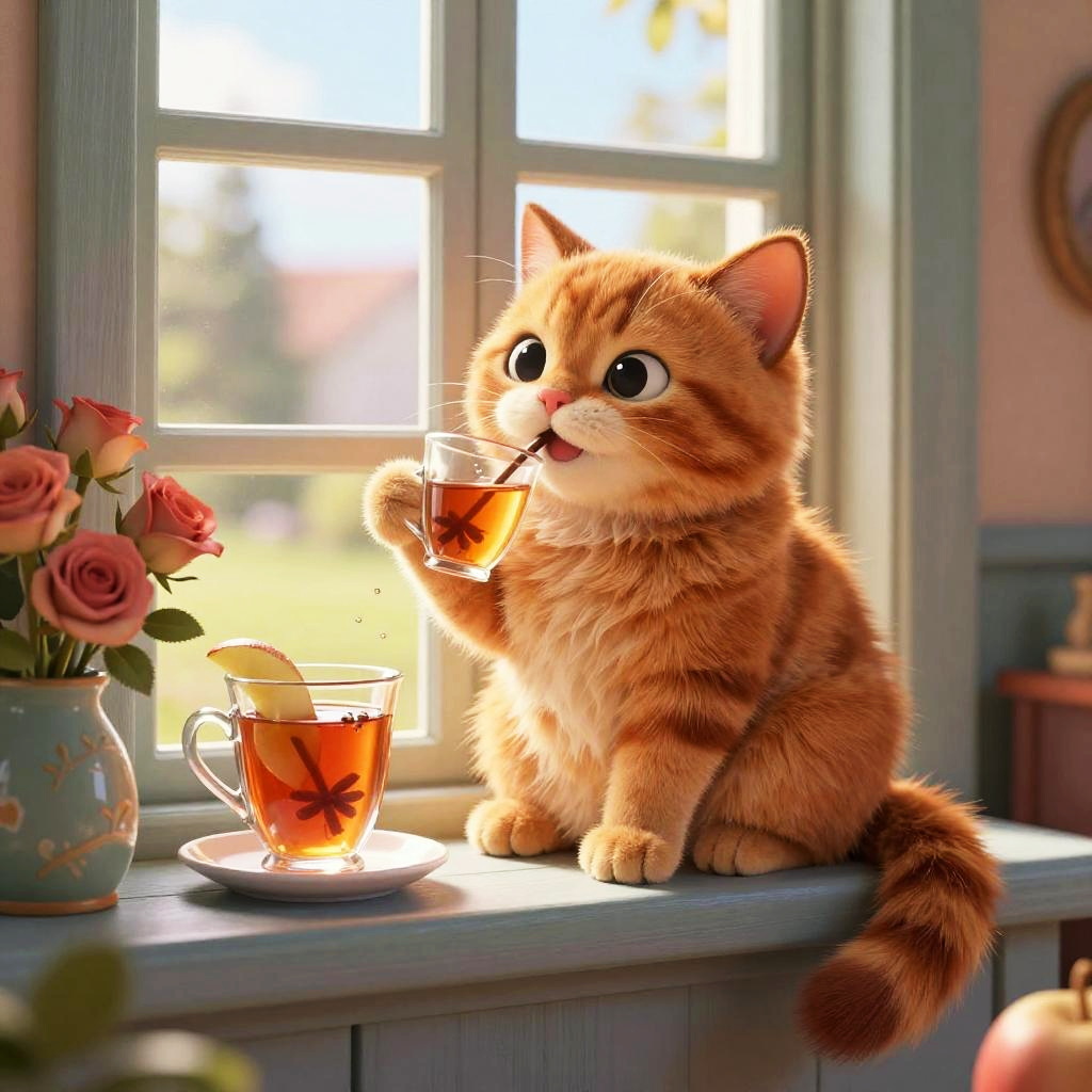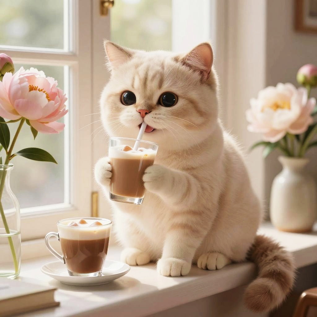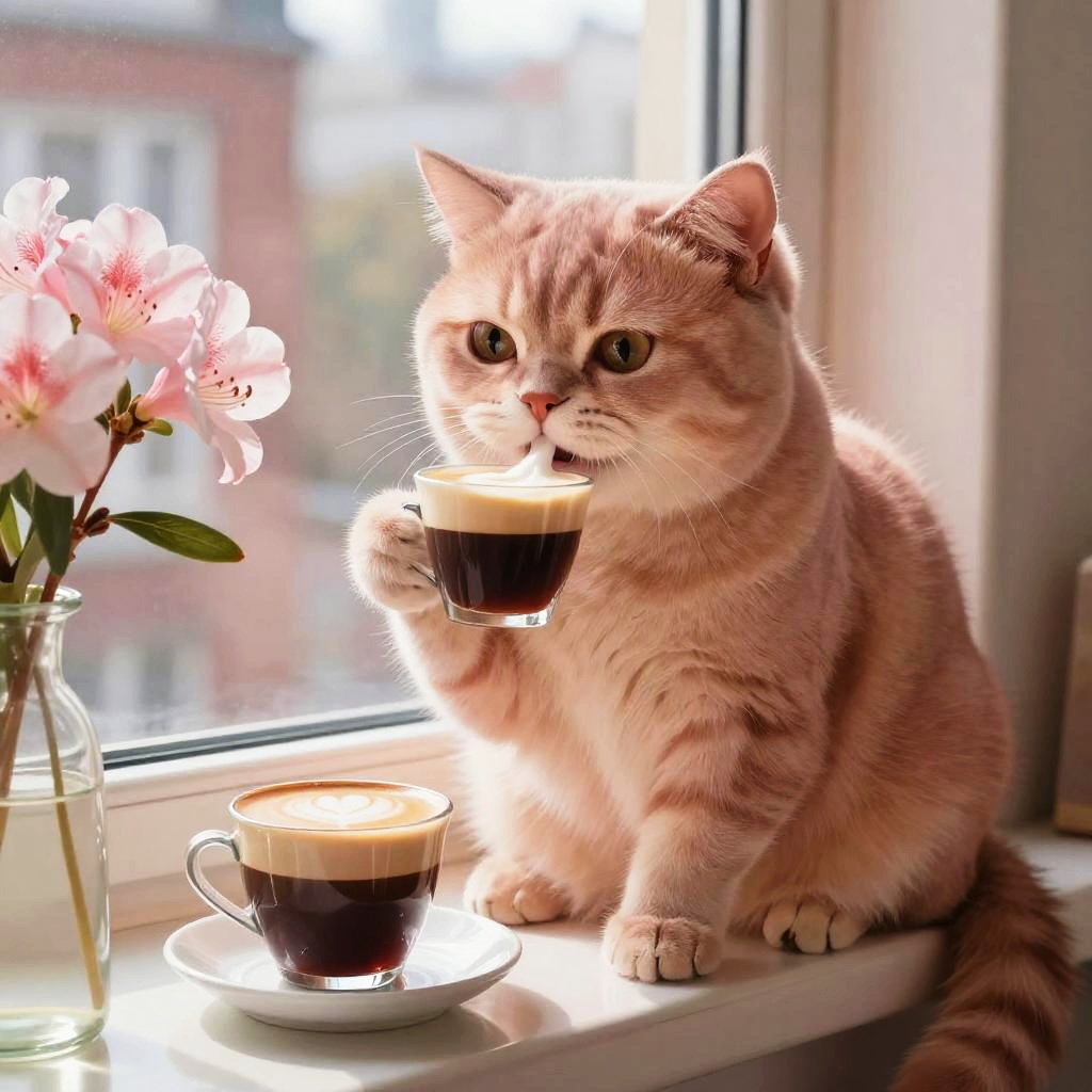 A whimsical, cute, fluffy rose gold british shorthair cat sitting on a windowsill with a cup of espresso macchiato and a vase of azaleas nearby. The cat drinks the espresso macchiato happily, with a gentle smile, looking adorable and relaxed. Styled as a realistic digital painting, this artwork captures the playful, cool personality of the cat in a cozy urban apartment windowsill.