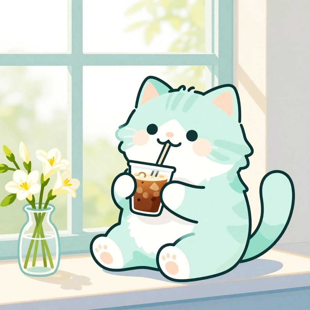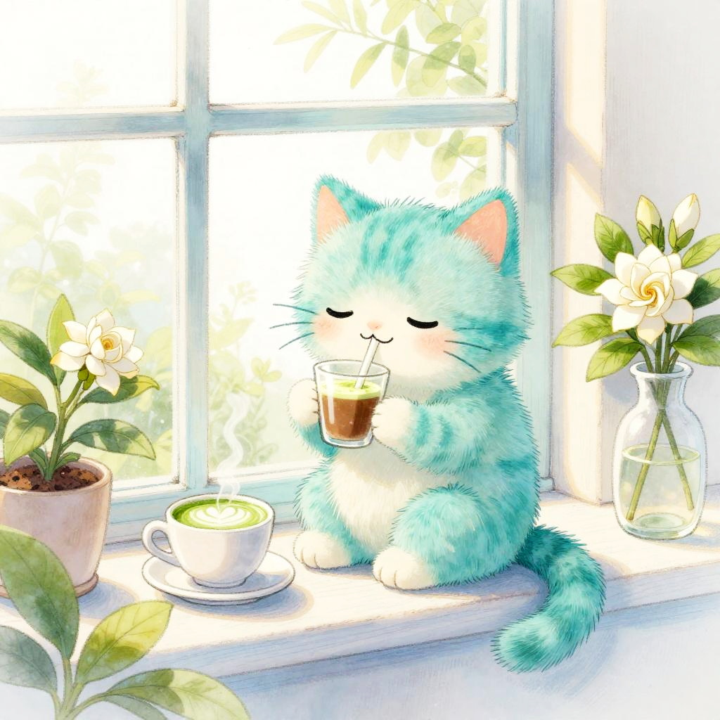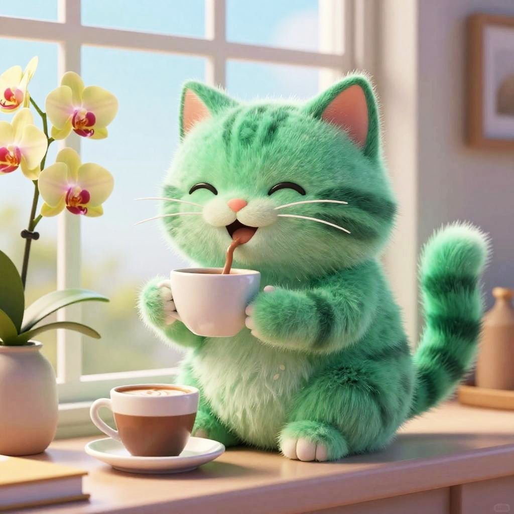 A whimsical, cute, fluffy rose gold british shorthair cat sitting on a windowsill with a cup of espresso macchiato and a vase of azaleas nearby. The cat drinks the espresso macchiato happily, with a gentle smile, looking adorable and relaxed. Styled as a realistic digital painting, this artwork captures the playful, cool personality of the cat in a cozy urban apartment windowsill.