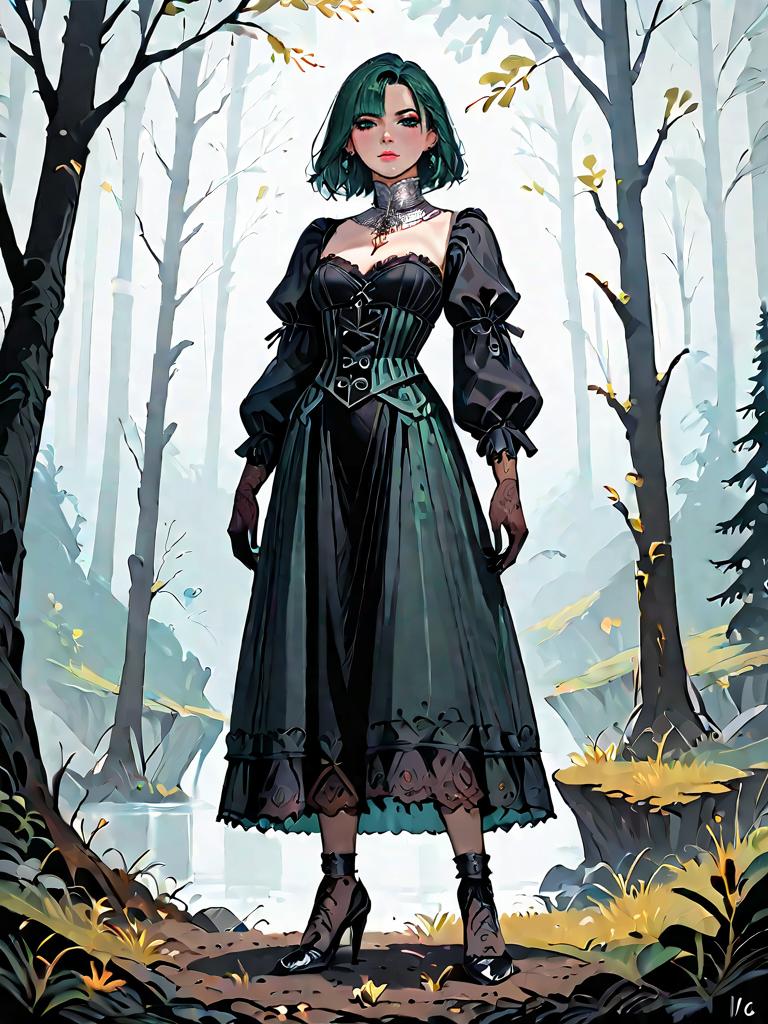 Full body, 1girl, dark_fantasy, medieval dark_forest, fog, torchlight, night mist ominous, comic Corset-inspired long sleeve dress, fitted bodice, lace-up front, satin fabric, deep burgundy color, flowing chiffon skirt, sheer long sleeves, delicate floral embroidery, vintage lace trim, ankle-length hem.