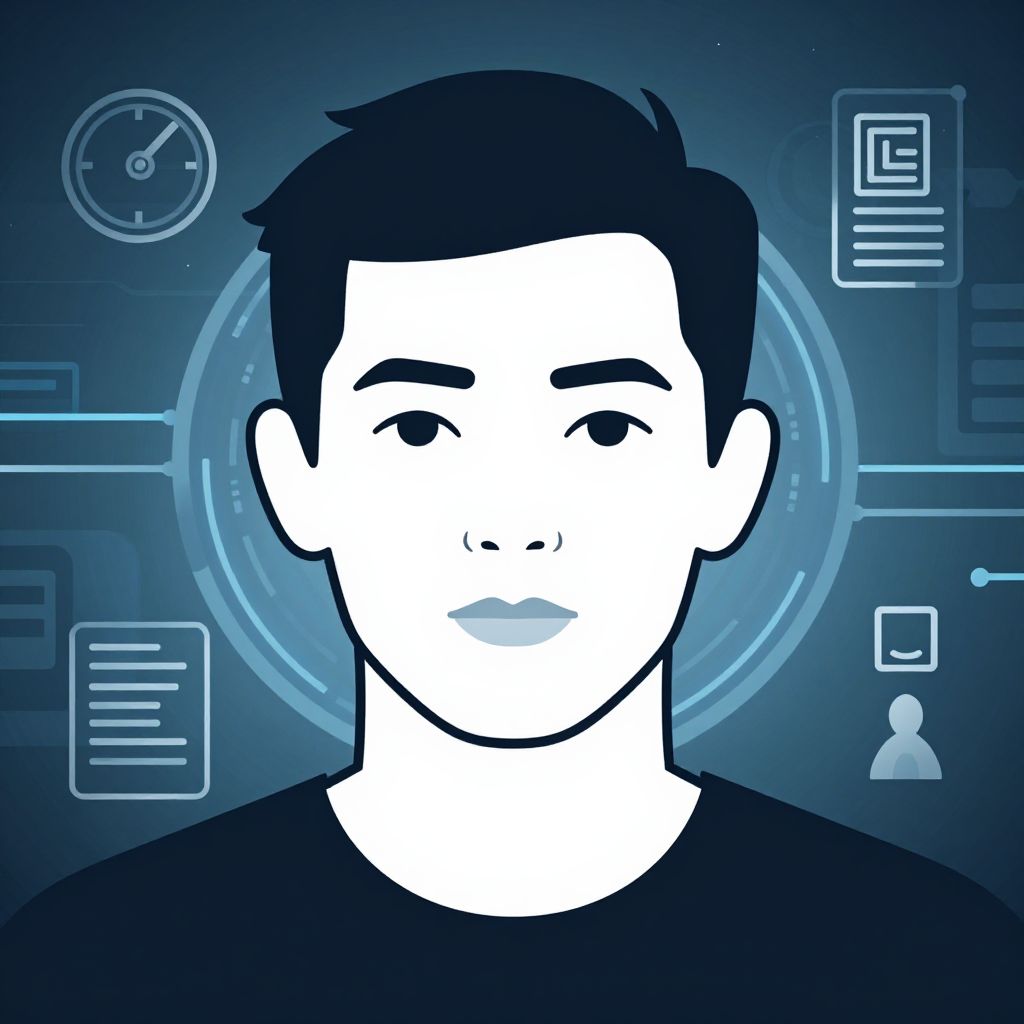 This is a digital illustration in a minimalist, flat design style. It features a white, stylized portrait of a young man with short, dark blue hair and simple black eyebrows, eyes, and lips. He wears a black shirt. The background is a deep blue with glowing, semi-transparent tech icons, including a clock, documents, and a user silhouette, arranged around his head. A large, circular blue grid pattern is centered behind him, adding a futuristic, tech-themed element to the image. The overall color palette is primarily blue and white.
