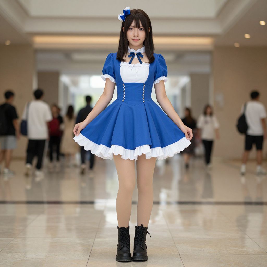 Photograph of an Asian woman standing outdoors in a blurred, crowded urban setting. She wears a pastel pink, puffed-sleeve dress with white lace trim, a matching pink bonnet with a ruffled edge, pink mary jane shoes, and white socks. The dress has a bow at the collar and a waist sash. Her black hair is peeking out from under the bonnet. The background features out-of-focus people in casual clothing, including white shirts and jeans, and a white canopy structure. The image has a soft, slightly dreamy quality, with a focus on the woman's delicate, vintage-style outfit.