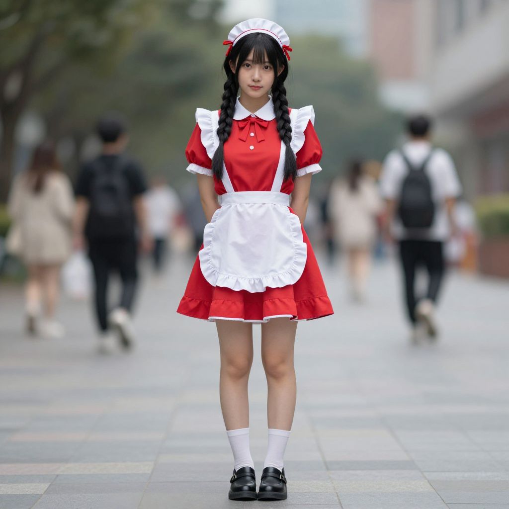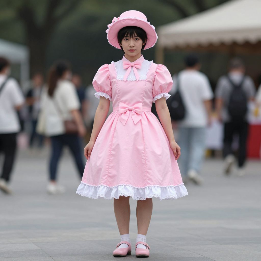 Photograph of an Asian woman in a pink, puffed-sleeve, lace-trimmed dress and matching hat, standing in a bustling outdoor
