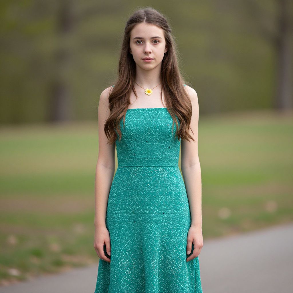 Forest green midi dress, 1girl, solo, long hair, flower, dress, brown hair, green dress, looking at viewer, blurry, blurry background, outdoors, aqua dress