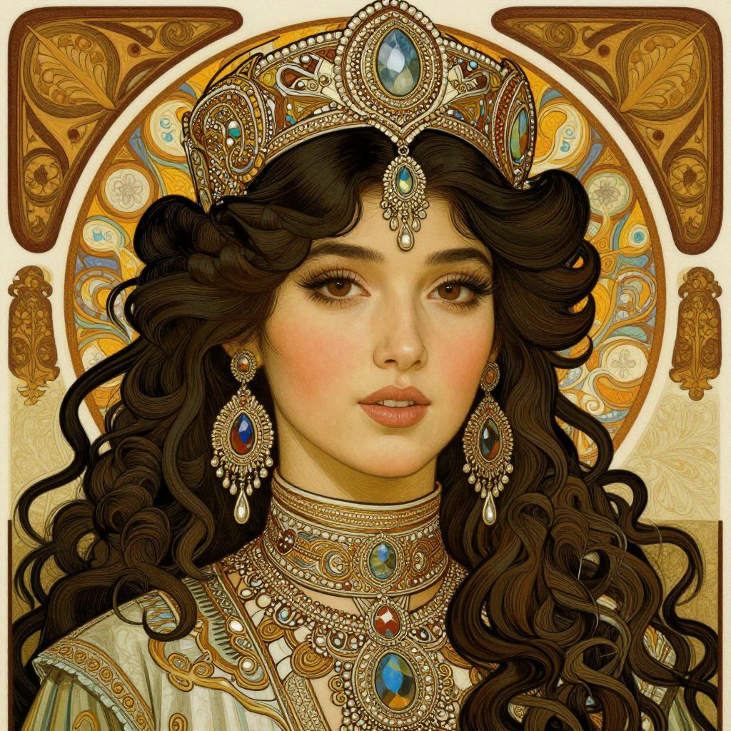 This digital artwork depicts a beautiful Middle Eastern woman with long, curly black hair adorned with a luxurious, ornate silver crown featuring large blue gemstones. She has fair skin, full lips, and dark, expressive eyes. She wears an elaborate necklace and choker, both embellished with intricate silver patterns and blue gems, matching her dangling earrings. Her attire is a detailed, embroidered robe. The background is a golden, circular halo with intricate, symmetrical patterns in gold and brown. The overall style is highly detailed and realistic, with a focus on rich textures and vibrant colors.