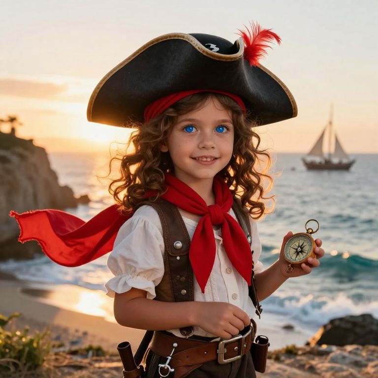 A lively young girl with vibrant curly brown hair, wearing a classic pirate hat with a wide brim and a red feather, paired with a flowing red scarf tied around her neck. She stands confidently on a sun-drenched coastal cliff, the sea breeze gently lifting her hair and scarf, with a warm golden sunset behind her. Her bright blue eyes sparkle with adventure, and she holds a small wooden compass in one hand, exuding charm and curiosity. The background features a distant sailboat and waves crashing softly on the shore, creating a whimsical and adventurous atmosphere.