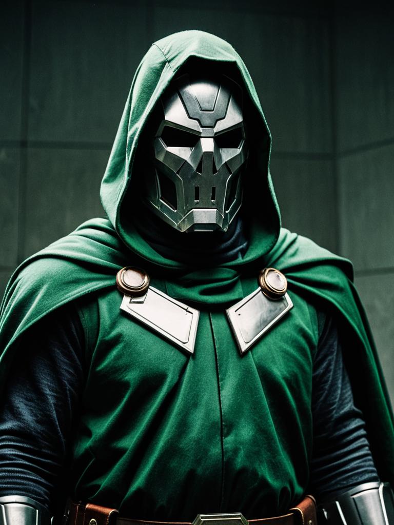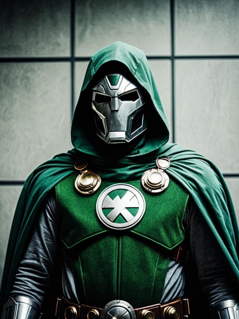 Man in Doctor Doom Costume, editorial cosplay portrait, cinematic tones
