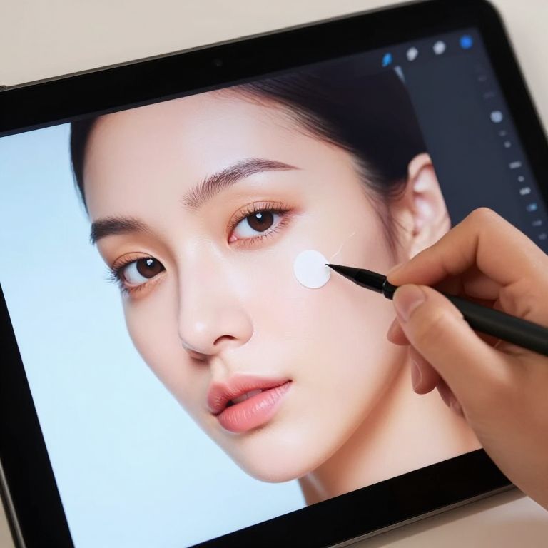 Close-up photograph of an Asian woman with fair skin and black hair, shown on a tablet screen, being digitally retouched with a precise brush tool.