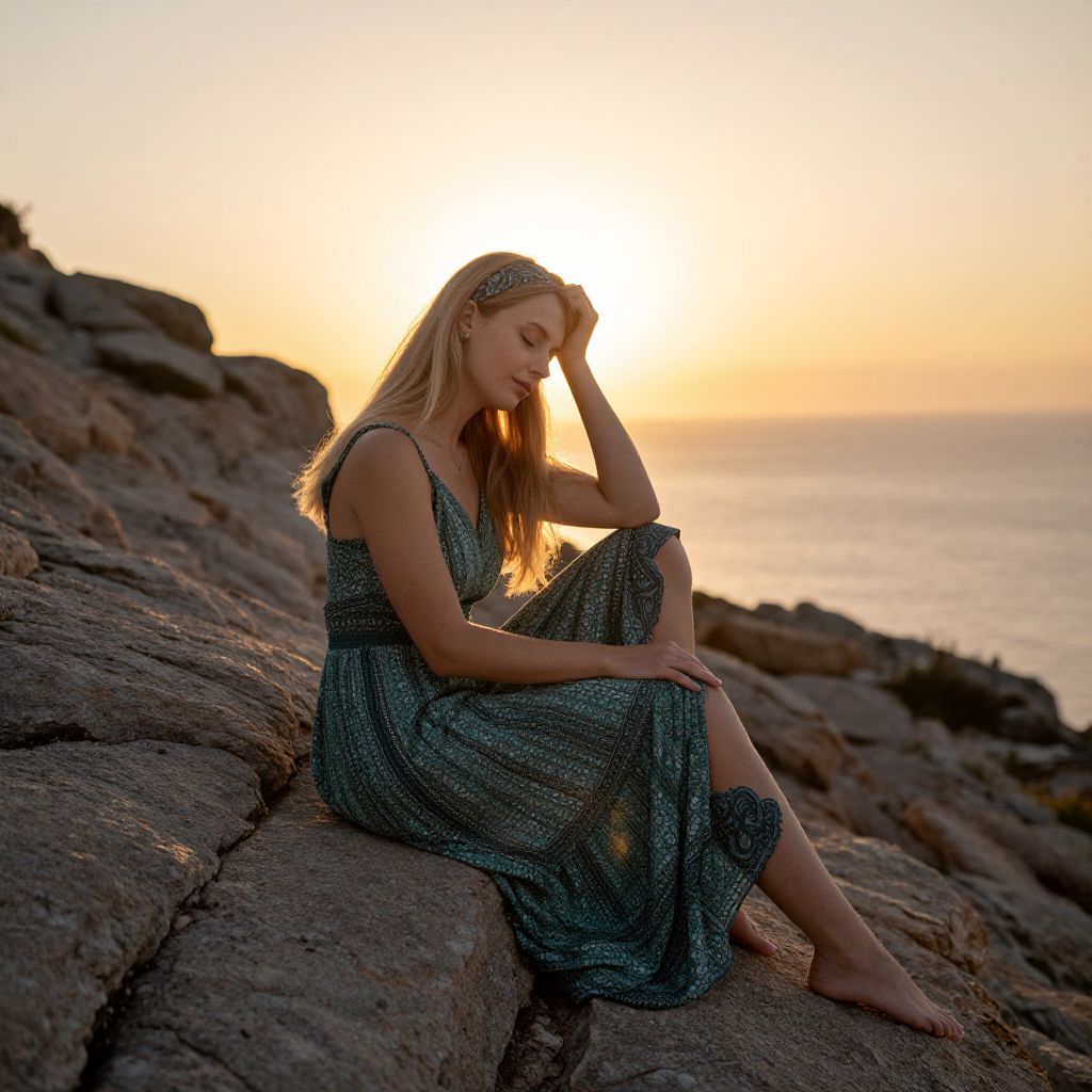 Photograph of a blonde woman with fair skin and a slender build, sitting on rocky terrain at sunset. She wears a loose, dark teal, patterned dress with thin straps and a headband with small, decorative beads. Her eyes are closed, and she rests her head on her right hand, looking contemplative. The sun is low in the sky, casting a warm, golden glow over the scene, and illuminating the ocean in the background. The rocks are textured and rugged, contrasting with her delicate appearance. Her left leg is bent at the knee, while her right leg is extended.