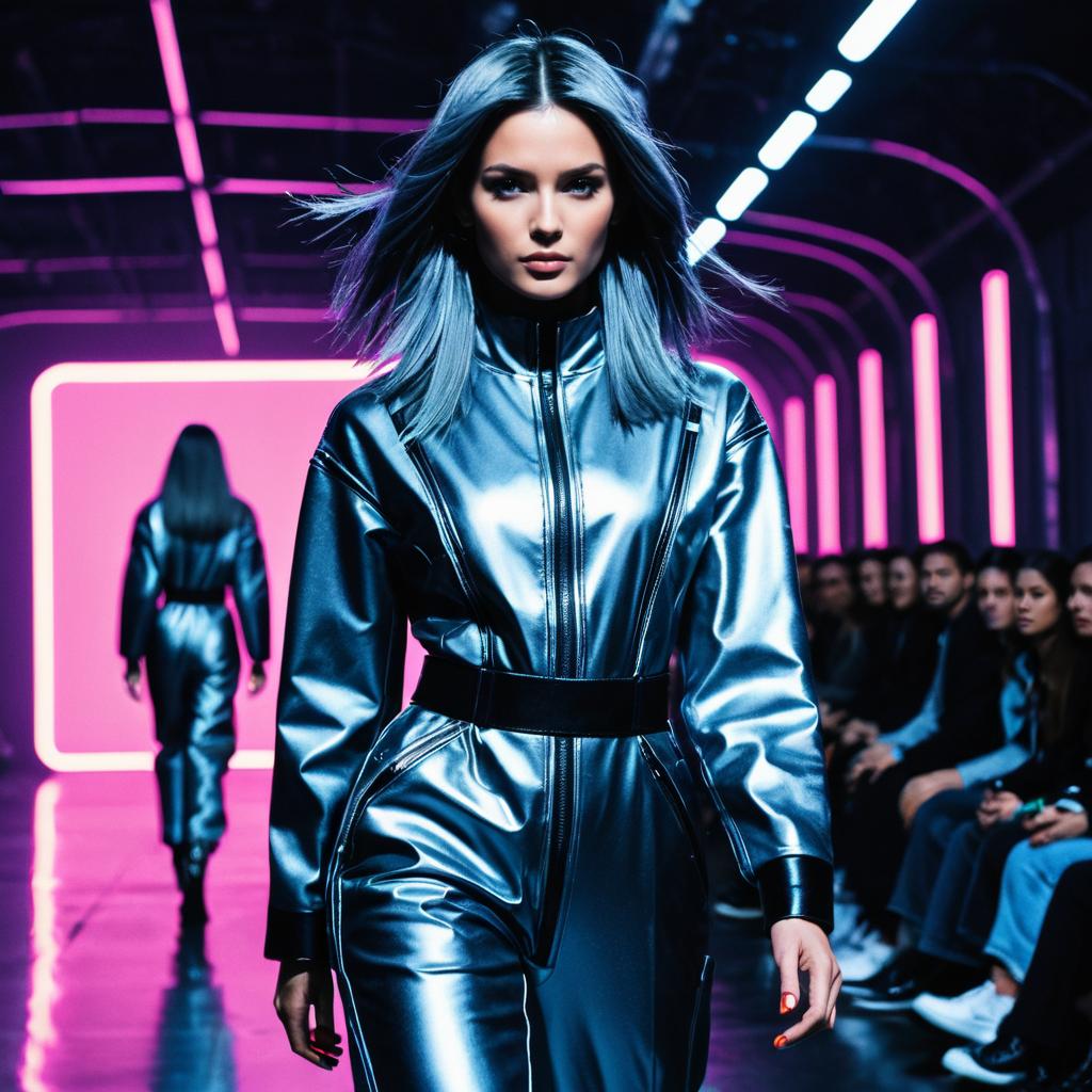Fashion model with steel gray hair walking on runway in a shiny metallic blue futuristic jumpsuit with black belt under neon pink and blue ambient lighting. Fashion show audience seated in background, setting a modern and edgy atmosphere.