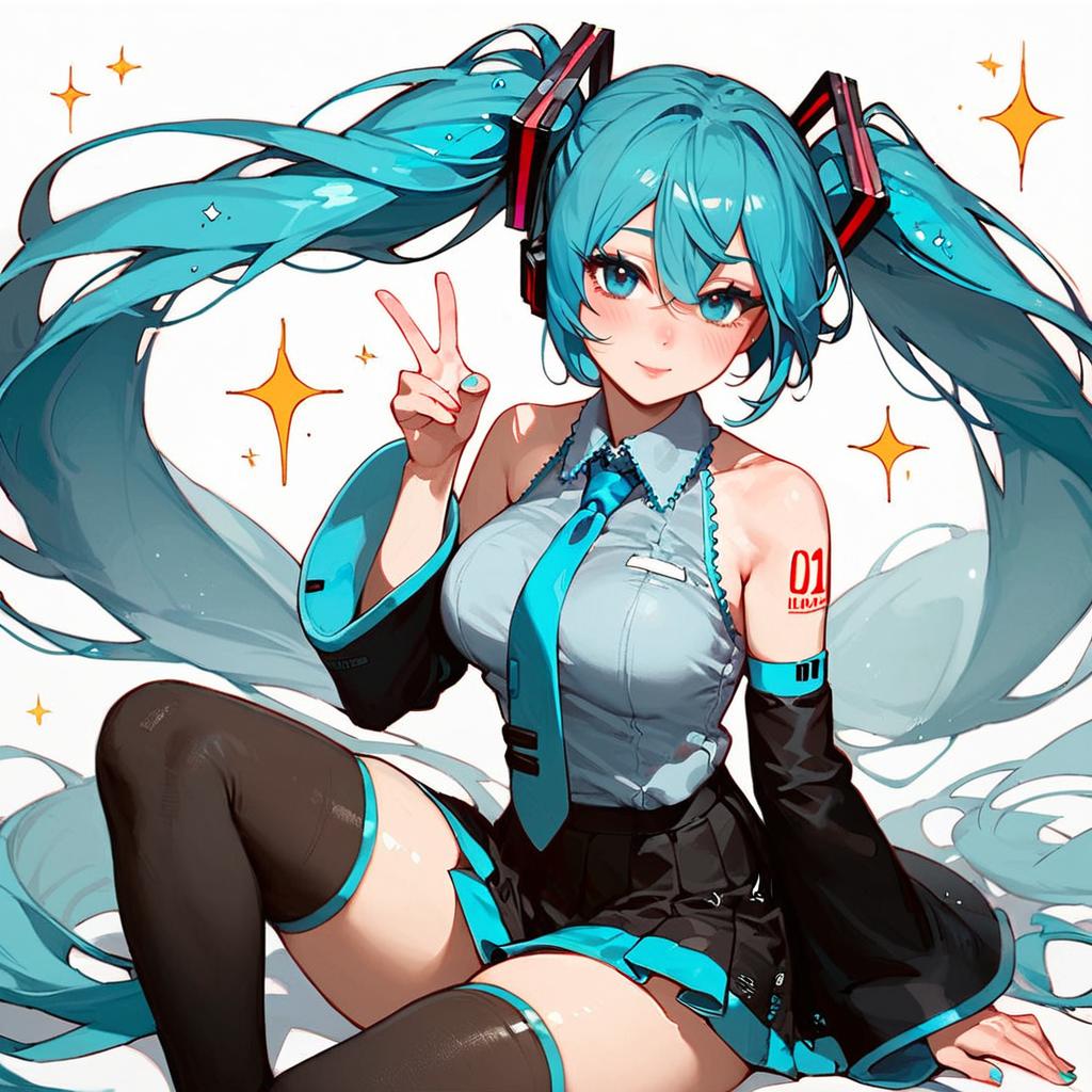Score_9, score_8_up, score_7_up, score_6_up, score_5_up, score_4_up, source_anime, rating_safe, (mature female:1.2), 1girl, solo, hatsune miku, twintails, long hair, detached sleeves, necktie, skirt, thighhighs, v, aqua eyes, aqua hair, white background, shirt, very long hair, sparkle, sitting, looking at viewer, black skirt, black thighhighs, sleeveless, blush, simple background, sleeveless shirt, tattoo, bare shoulders, aqua necktie, pleated skirt, hair ornament, grey shirt, black sleeves, zettai ryouiki, hand up, miniskirt, bangs, closed mouth, feet out of frame