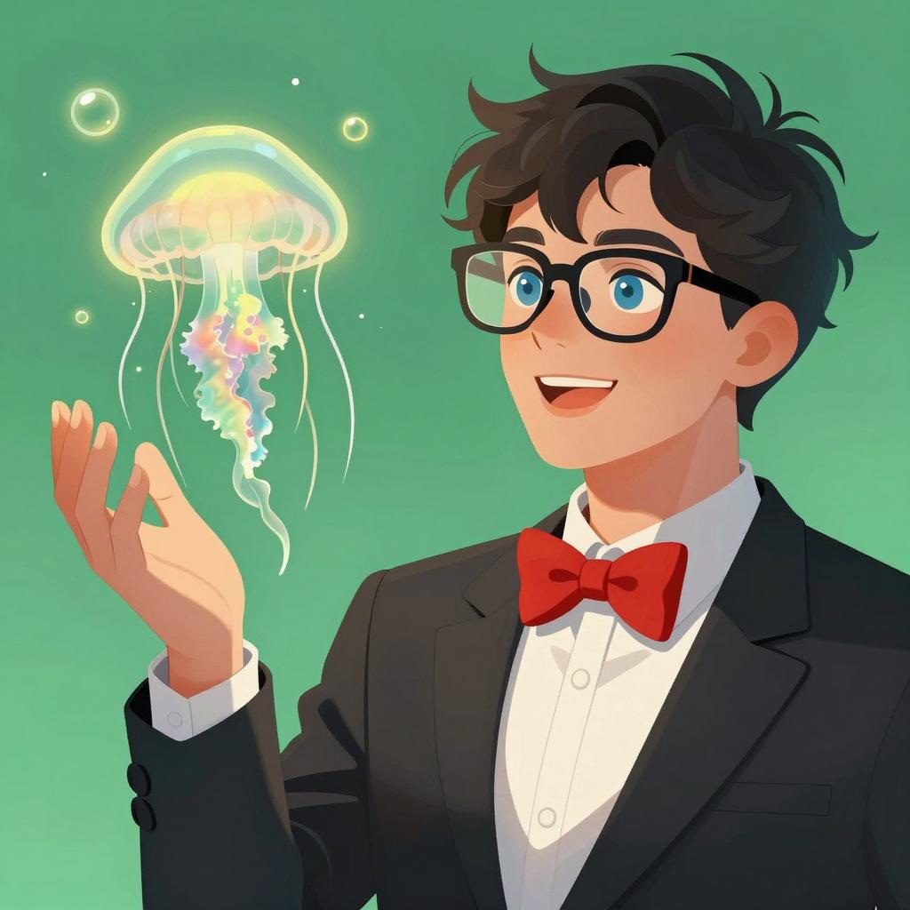 Man with disheveled dark hair, blue eyes, red bow tie, black suit, white shirt, holding transparent green jellyfish with black glasses. Green background with yellow glow and bubbles. Man smiling, jellyfish floating above hand. Digital illustration.