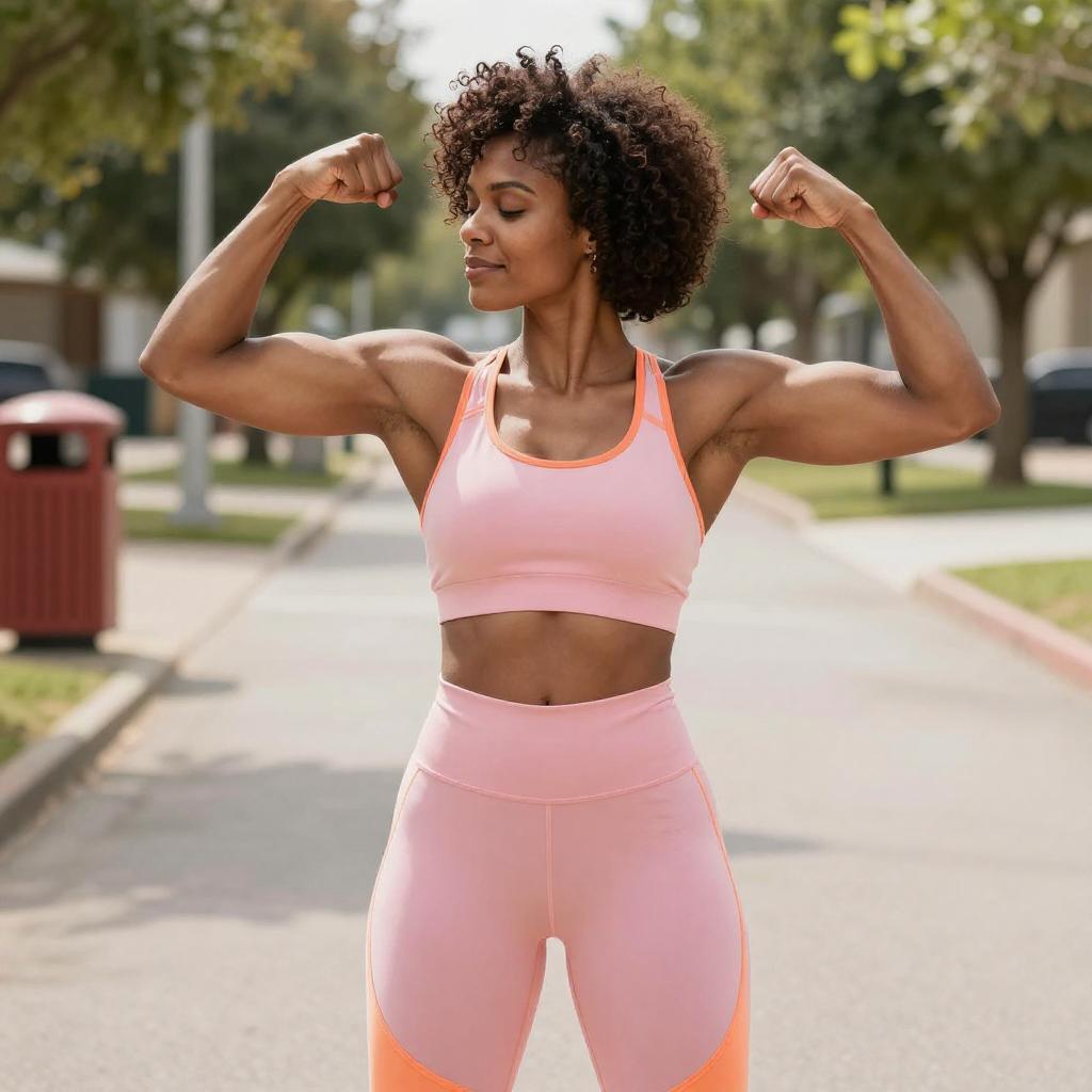 Photograph of a muscular, dark-skinned woman with long curly hair, wearing a gray headband, black Nike sports bra, and black athletic shorts. She holds a pink dumbbell in her right hand, flexing her bicep. She stands against a ured white wall, showcasing her defined abs and toned legs.