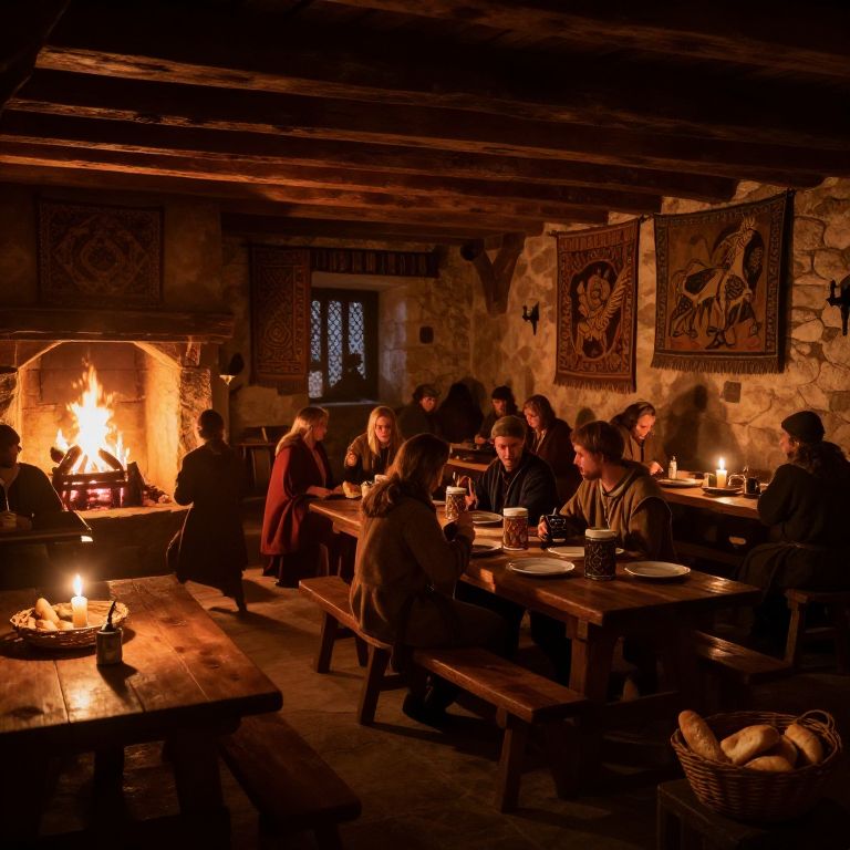 Photograph of a dimly lit, rustic tavern. Wooden beams and stone walls create a cozy, medieval atmosphere. A roaring fireplace on the left casts warm, orange light. A group of 12 people, dressed in dark, medieval-style clothing, sit at wooden tables, engaging in conversation and drinking from mugs. Two tapestries with intricate patterns hang on the stone wall in the background. Candles on the tables and a basket of bread on the right add to the warm, ambient lighting. The scene evokes a historical, communal gathering.