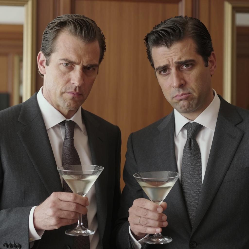 Photograph of two men in suits holding martini glasses. Both have dark, slicked-back hair. The man on the left has a serious expression, while the man on the right looks slightly confused. Background includes wooden panels and a mirror.