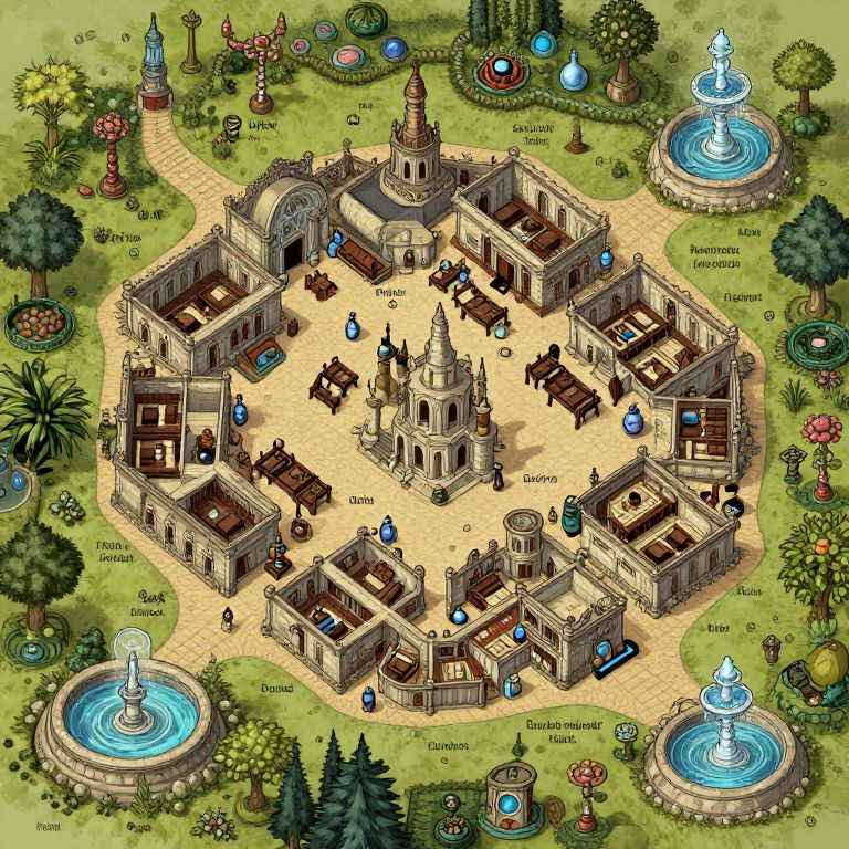 DND hospital map, fantasy RPG map showing a sprawling medieval hospital complex surrounded by enchanted gardens and sacred healing fountains, including examination rooms, potion brewing areas, infirmaries, and staff quarters, hand-drawn style with clear labels and mystical atmosphere suitable for tabletop gameplay.