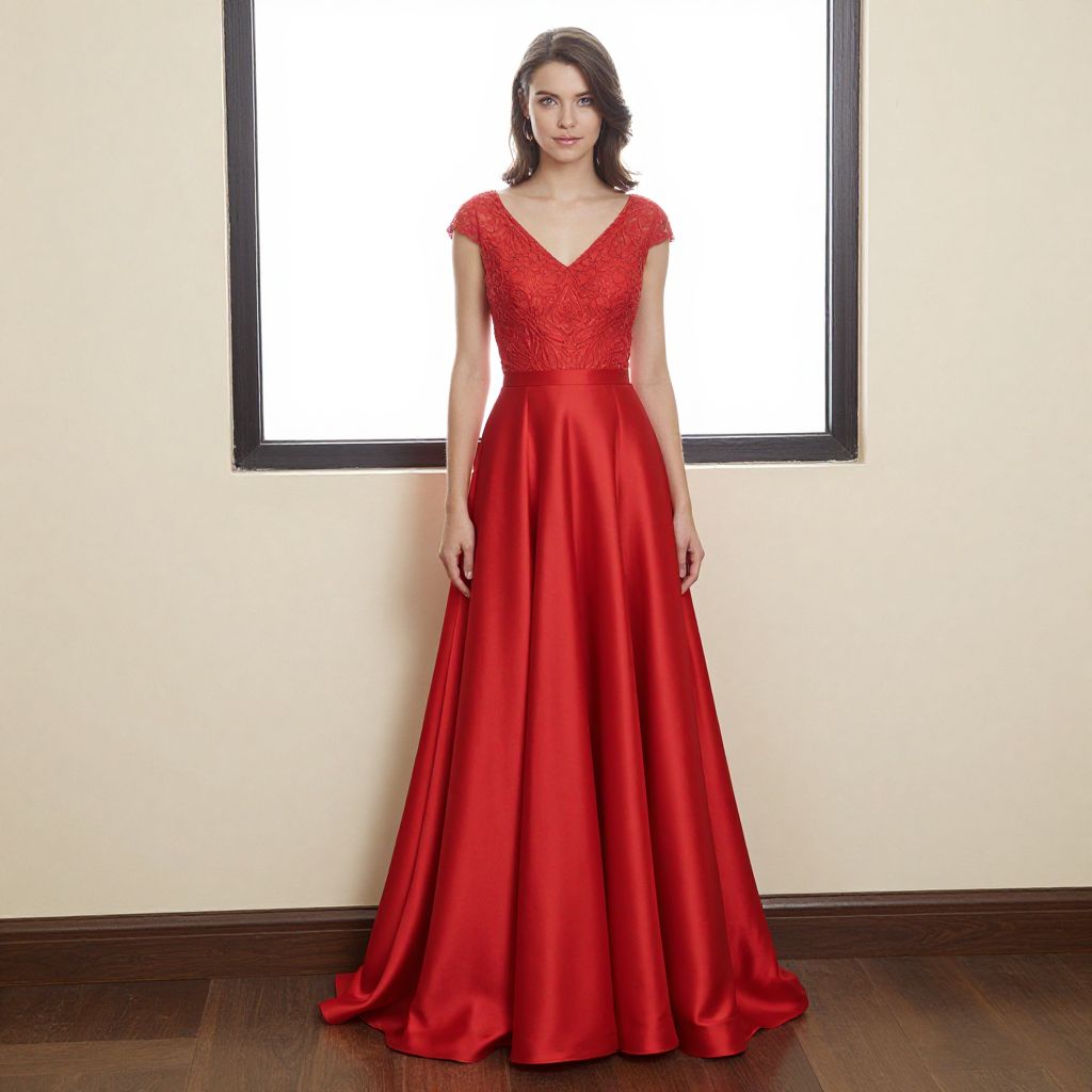 Photograph of a Caucasian woman with fair skin and wavy dark brown hair, standing against a white wall with a black-framed window behind her. She wears a vibrant red, floor-length evening gown with a deep V-neck and short sleeves, featuring intricate lace detailing on the bodice and a satin skirt that flows elegantly. Her expression is neutral, with a slight, confident smile. The wooden floor beneath her has a dark, polished finish. The lighting is bright, highlighting the dress's rich color and texture. She stands centered, with her arms relaxed by her sides.
