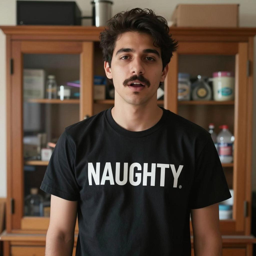 Young man with short dark hair and mustache, wearing a black T-shirt with "NAUGHTY" in white letters, stands in a cluttered room. Wooden cabinets with glass doors filled with various items are in the background. He has a slightly open mouth and a relaxed expression. One metallic object is on top of the cabinets. He is in the center-right of the image.
