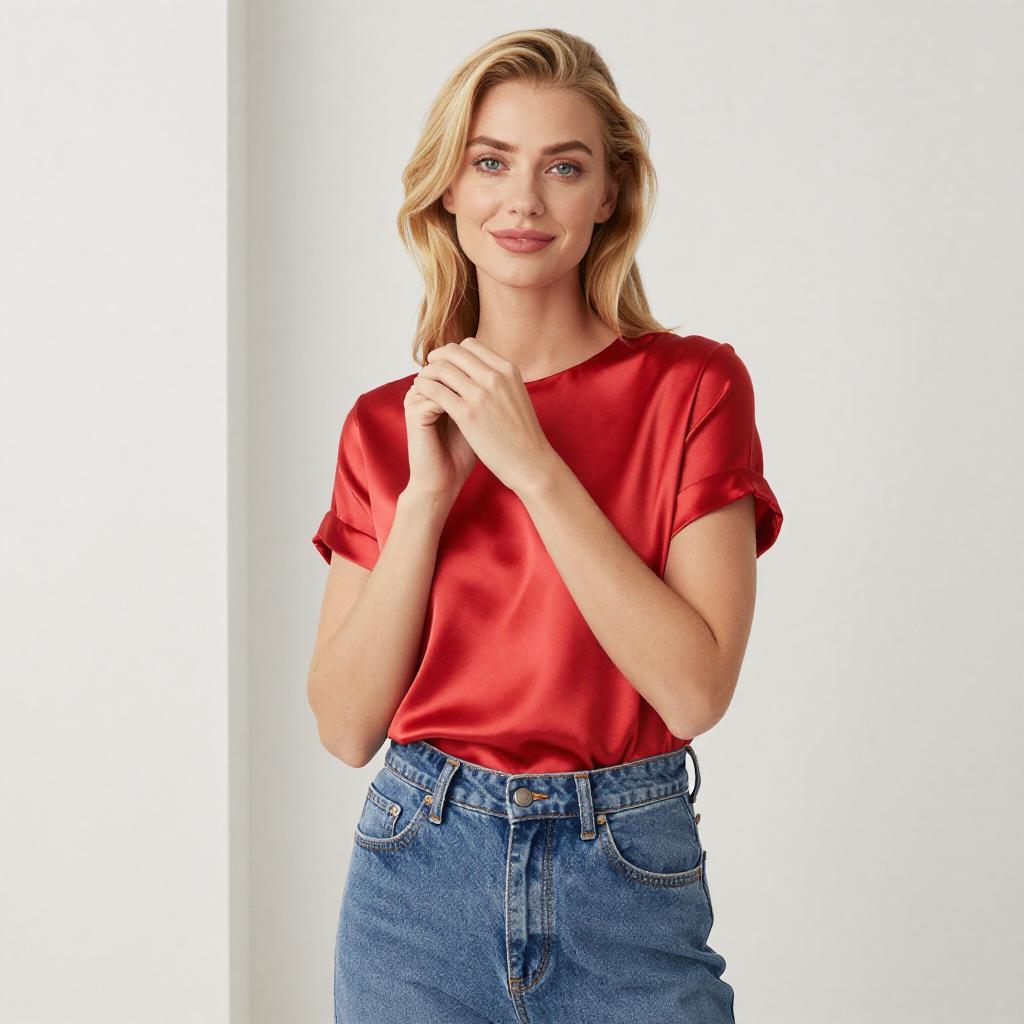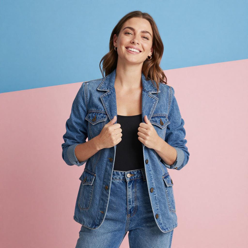 Photograph of a blonde woman with long, wavy hair, wearing a white crop top and a red plaid overcoat with sleeves rolled up. She has blue nail polish, her hands in her coat pockets, and is smiling slightly. She is standing against a plain white background.