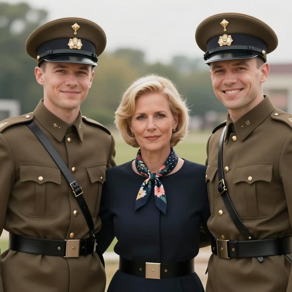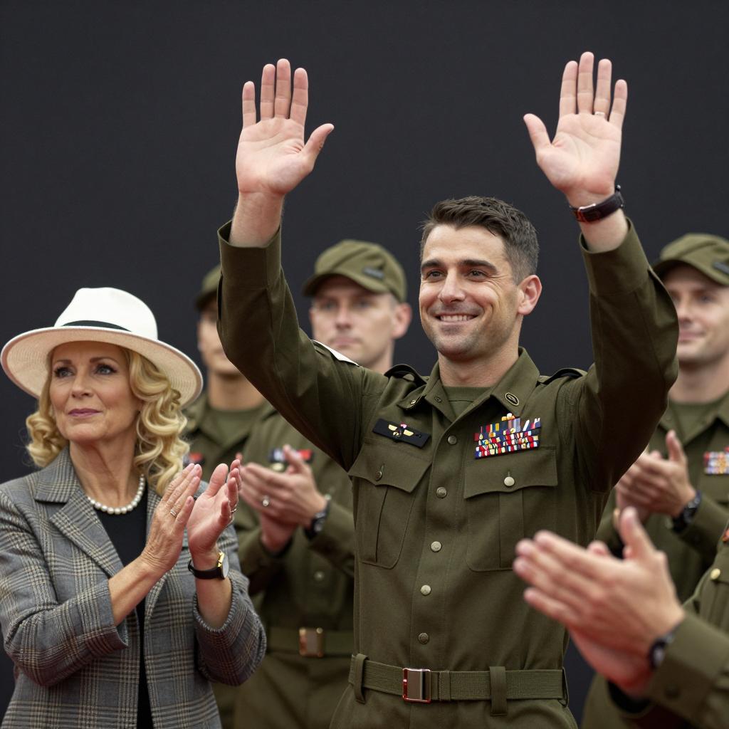 Military man with dark hair, olive green uniform, and medals, raises both arms smiling. Blonde woman with curled hair, plaid jacket, white hat, and pearl necklace, claps hands. Three soldiers in background, applauding. Dark background, visible hands in foreground.