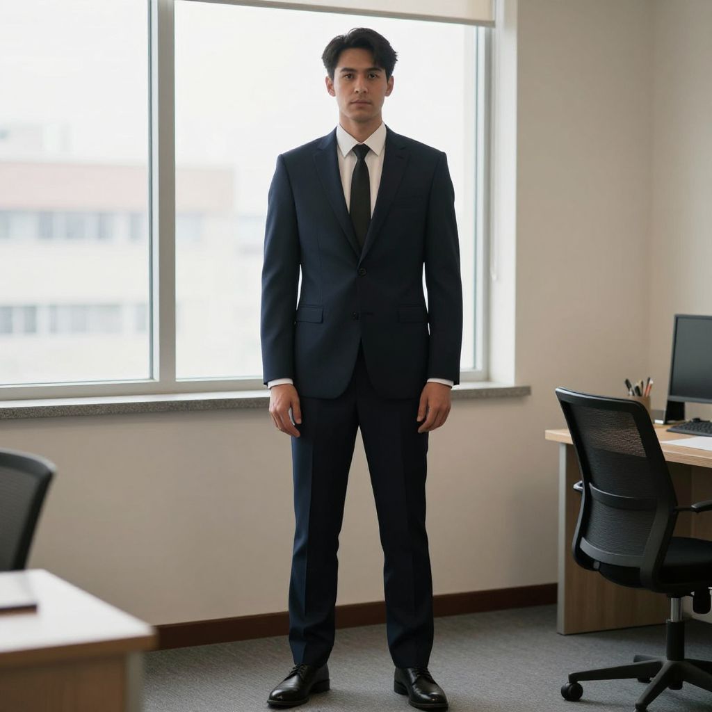 Simple Office Wear Costume, man in a suit standing in a room with a window