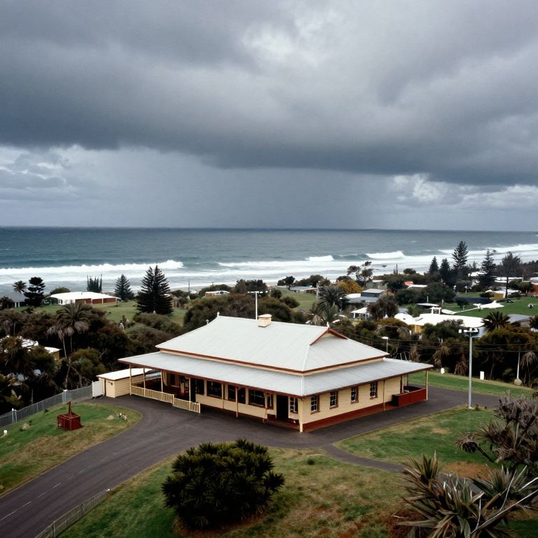 Josei drawing of a 70s grainy photograph of australian style old pub up on the hill pulled back drone view looking over angry ocean on a stormy day,