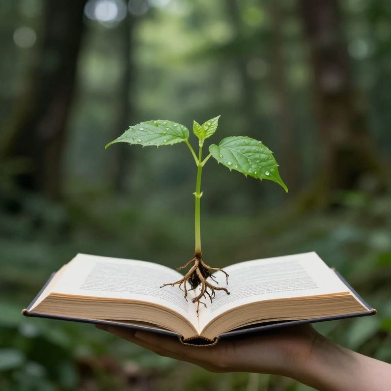 A hand cradles an open book from which a vibrant green plant sprouts, its roots extending into the palm, defying the boundary between literature and life in a forested, ethereal setting.