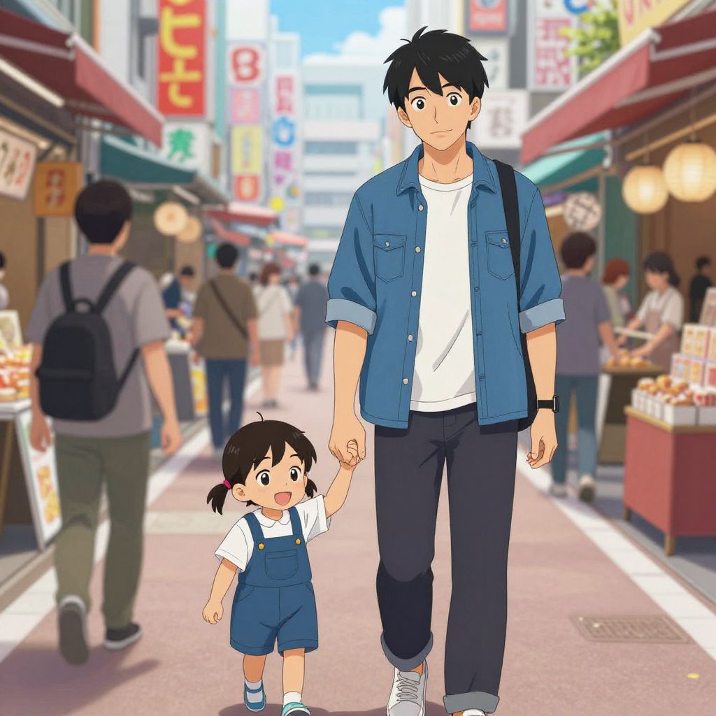 Japanese daddy in modern casual wear, holding hands with his child at a bustling Tokyo street market, vibrant colors, dynamic composition, anime-inspired art