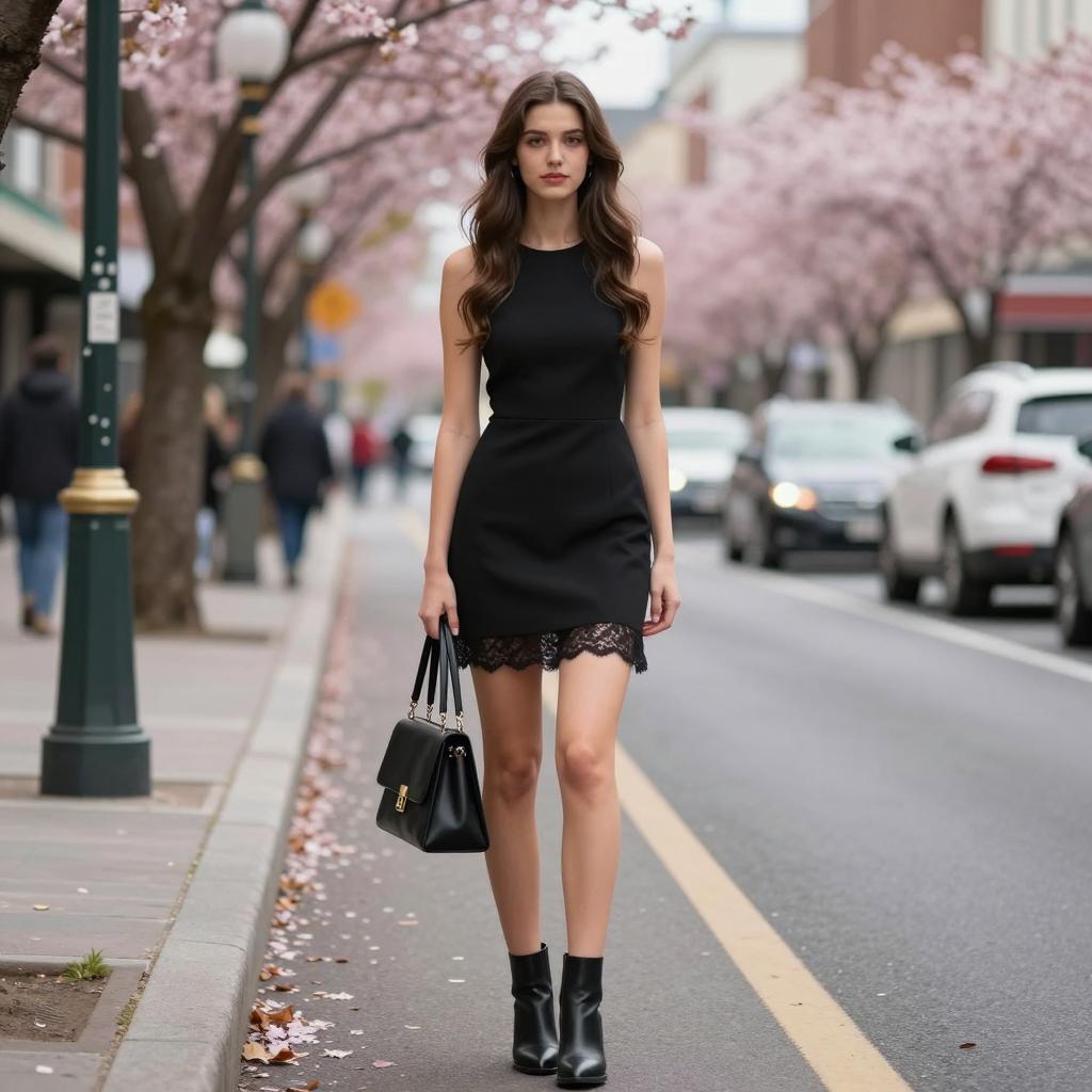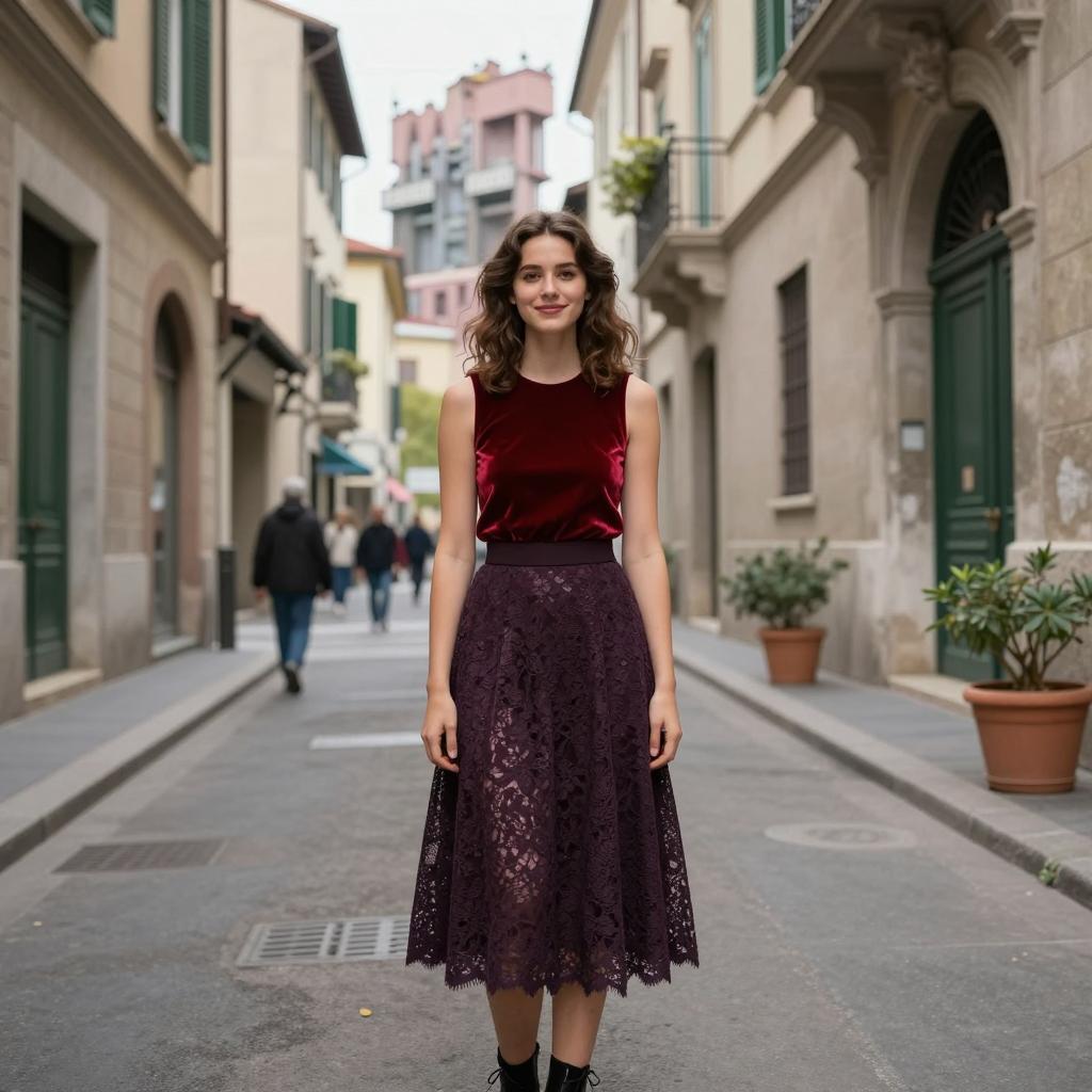 Hollywood tower terror, photograph of a young woman standing in a narrow European street, daytime, cityscape, historical architecture, woman with wavy brown hair, wearing sleeveless red velvet top, high-waisted dark purple lace skirt, black boots, natural makeup, slight smile, background with old buildings, green doors, people in the distance, potted plants on the right, arched doorway, green and beige color palette, realistic style, high detail, clear lighting, street photography vibe