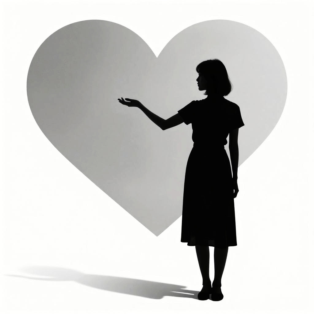 Black and white silhouette of a woman standing in profile against a large heart shape background. The woman has short hair, wears a short-sleeved dress with a skirt, and extends one arm forward. The composition features a distinct shadow and an abstract, minimalist style.