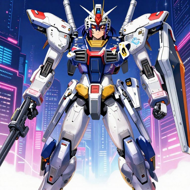 Digital art of a blue and white glowing mecha robot flying over a neon-lit futuristic city skyline at dusk.