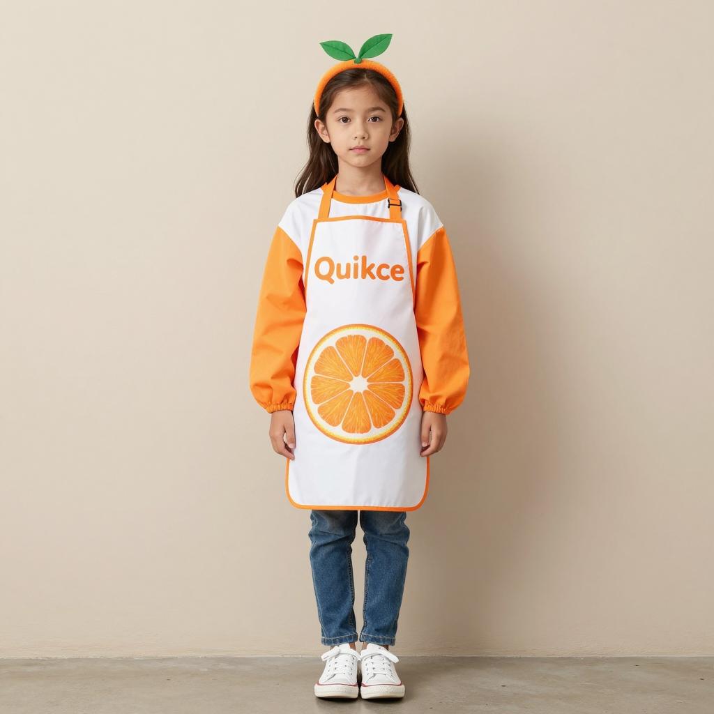Portrait of an Asian girl with long brown hair wearing a white and orange apron featuring an orange slice design and the word 'Quikce'. She has on orange sleeves, blue jeans, white sneakers, and an orange hairband with green leaves. The girl stands against a plain beige background with a neutral expression.