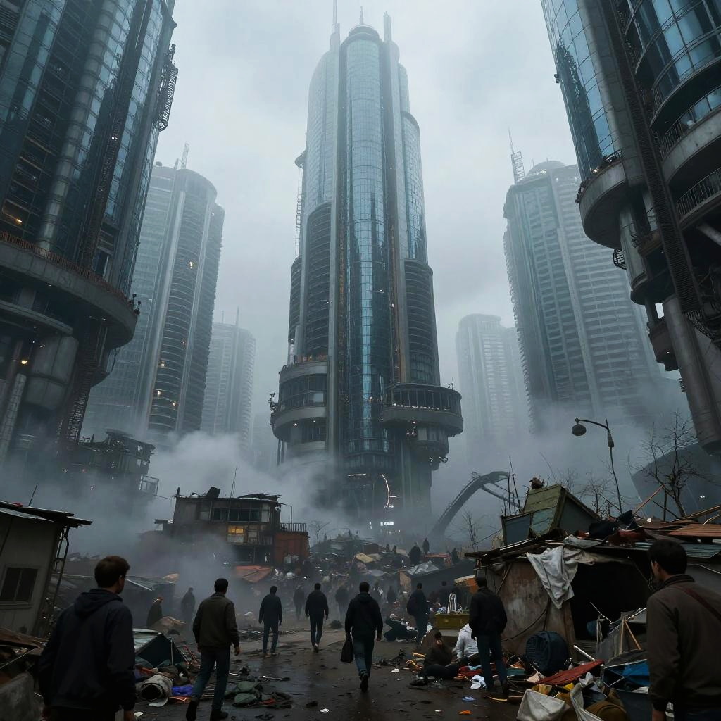 Dystopian futuristic cityscape showcasing a stark contrast between towering, sleek glass skyscrapers and overcrowded, dilapidated slums below. Heavy fog and pollution create a cold, bleak atmosphere with blue and gray hues. Figures of people walk through the rundown area, emphasizing disparity and tension.