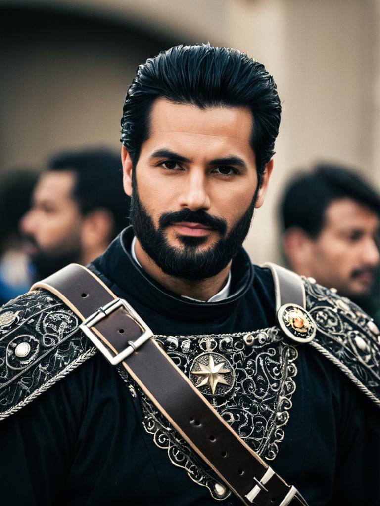 Fezzik costume princess, 1boy, male focus, solo, facial hair, beard, looking at viewer, blurry background, blurry, realistic, black hair, belt, upper body