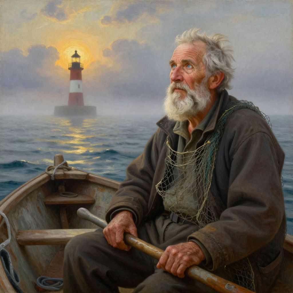Create a photorealistic portrait of an elderly fisherman with intense blue eyes and a flowing white beard, artfully composed and rendered with the nuanced detail of a fine art oil painting. In the scene, the fisherman sits in the foreground of a dilapidated wooden boat, his weathered body relaxed, with a worn fishing net draped casually over one shoulder. His intense gaze is directed towards a distant lighthouse that stands resolute on the foggy horizon, piercing the mist. Soft, warm sunlight breaks through the clouds, casting a golden glow and long shadows across the choppy waters, drawing attention to the intricate texture of his wrinkled hands firmly grasping a worn oar. This portrait captures the emotional depth of solitude and quiet introspection, reflected in the serene expression on the fisherman's face, as he contemplates the vast, enigmatic sea before him.