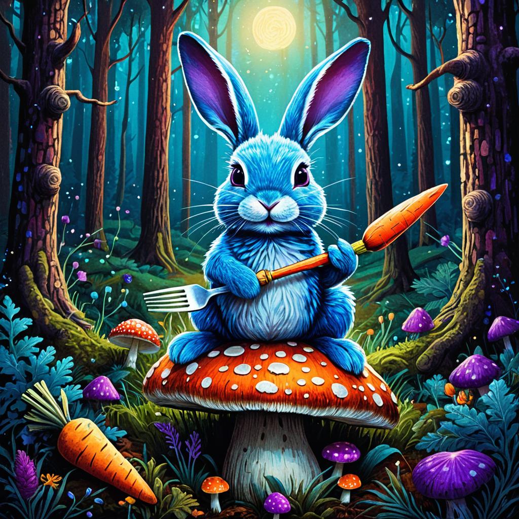 An illustration of a whimsical blue rabbit seated on an oversized mushroom in a magical forest, holding a tiny fork and knife over a glowing purple carrot, rendered in bright bold colors with folk art style, textured brushstrokes and naïve simple shapes for vivid complementary contrast.