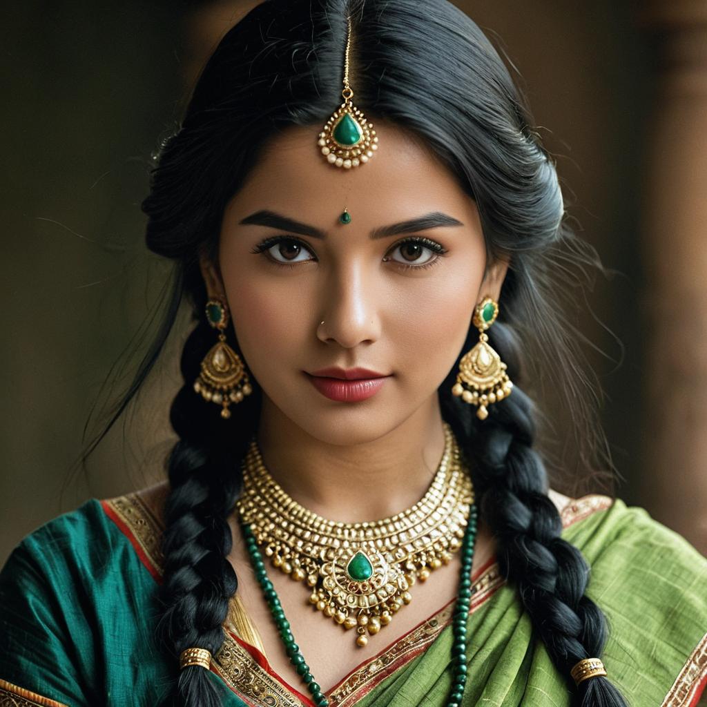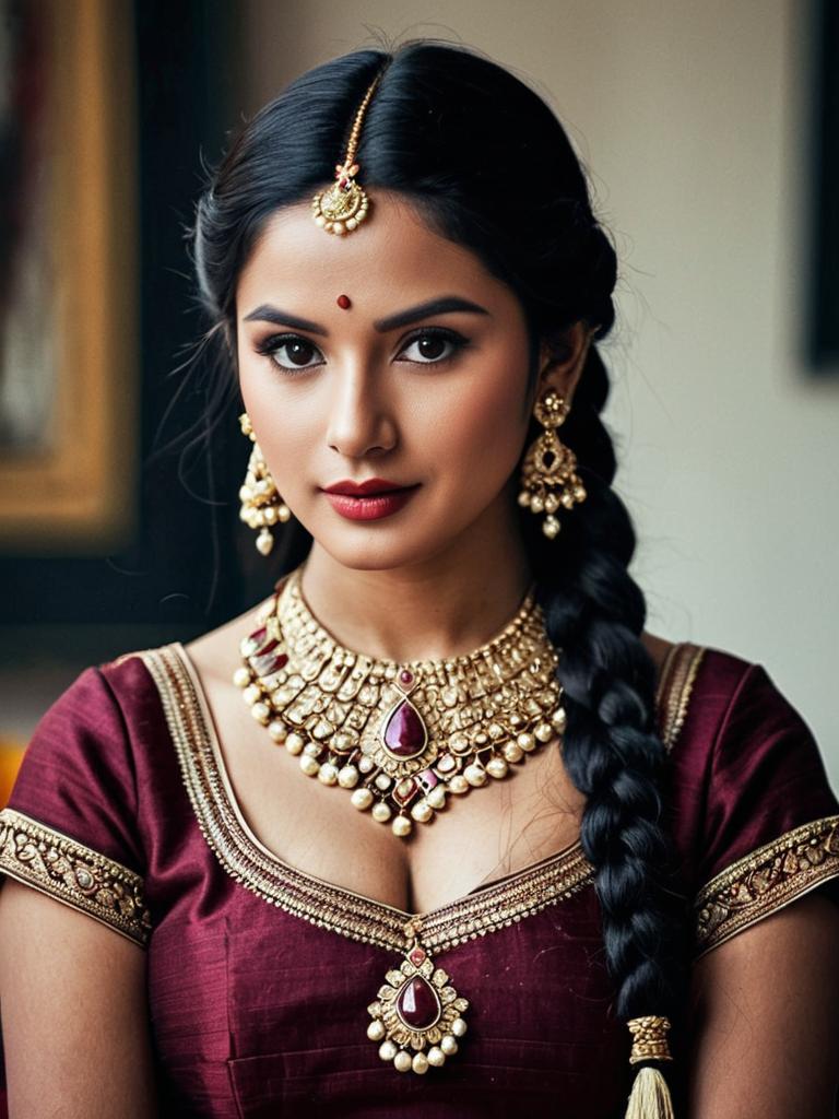 Portrait of an Indian woman wearing a burgundy lehenga adorned with intricate gold embroidery. She has long black braided hair and is accessorized with traditional gold jewelry including a necklace, earrings, and maang tikka. The woman has a red bindi on her forehead and is looking directly at the viewer against a softly blurred background.