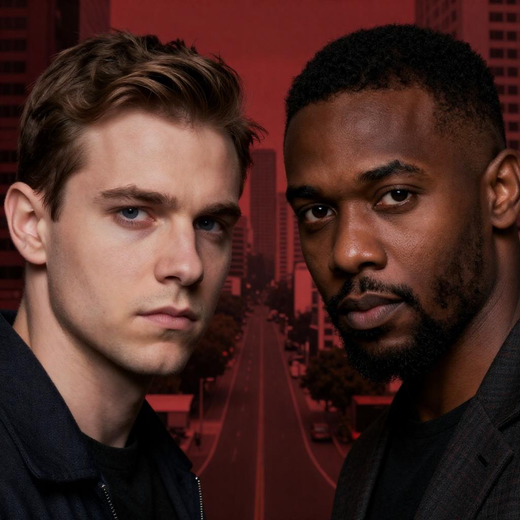 Close-up portrait of two young Caucasian men with short dark hair and blue eyes. The man in the foreground wears a green shirt over a white t-shirt, has an intense gaze facing the camera. The man in the background is dressed in a blue denim jacket over a white t-shirt, with a slight smile. Both stand against a neutral background with a partially visible pattern.