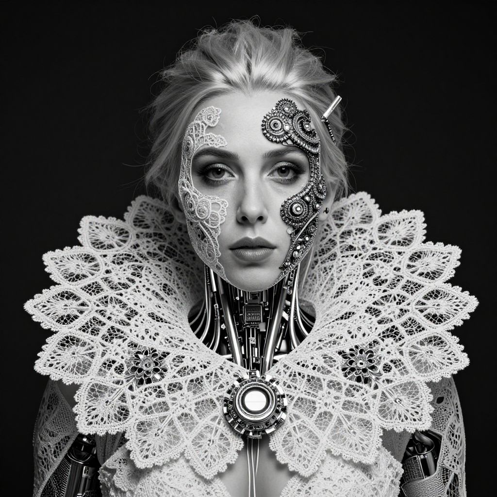 Cyberpunk portrait of a woman with intricate lace collar, mechanical facial implants, and monochrome contrast, set against a black background.