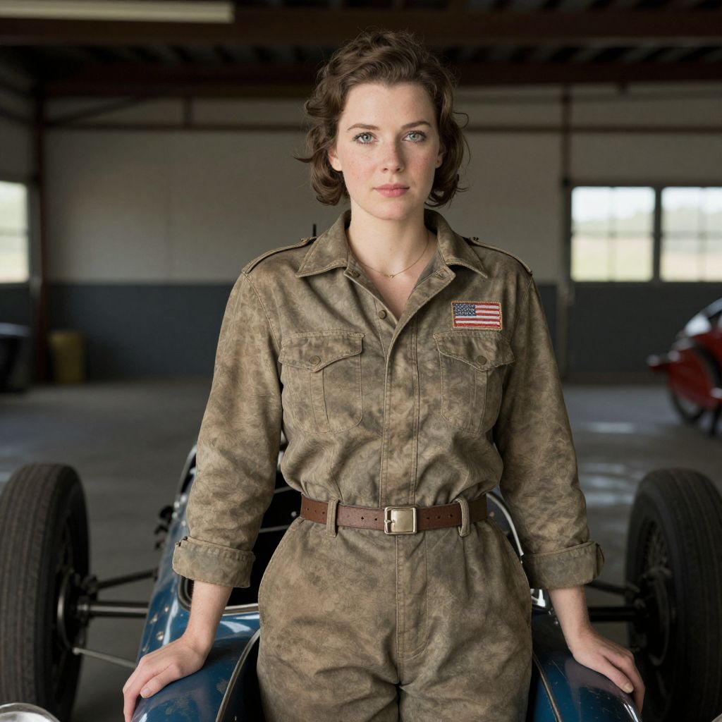 Photograph of a elegant 1930s pilot in a red silk scarf draped over her shoulders and tied around her collar, standing confidently beside a vintage Lockheed Vega aircraft at a retro-style aviation museum, her expressive face showing determination and grace, with fluted vintage fashion elements and vintage-era wooden signage in the background