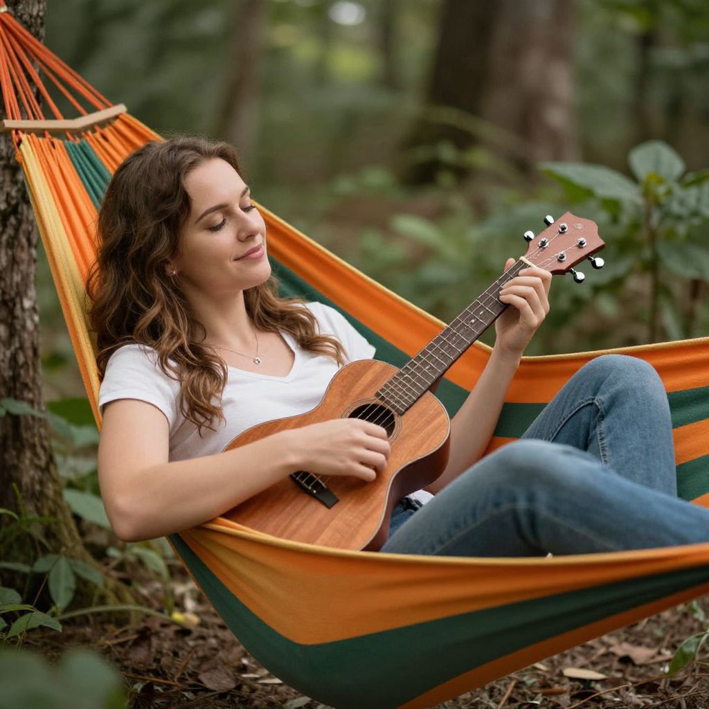 Woman lounging in a vibrant orange and green hammock, strumming a wooden ukulele with a serene smile amidst a lush forest backdrop.