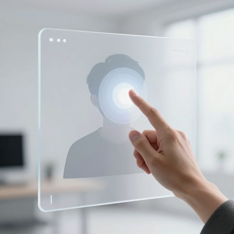 Photograph of a hand with light skin tone, index finger touching a transparent, white-bordered digital screen displaying a silhouetted head with a bright white, glowing center where the face would be. The background is a blurred, bright, white office space with a desk and computer monitor partially visible on the left. The screen and hand are in sharp focus, highlighting the futuristic, augmented reality (AR) interface. The hand is positioned in the right third of the image, with the screen taking up the left two-thirds.