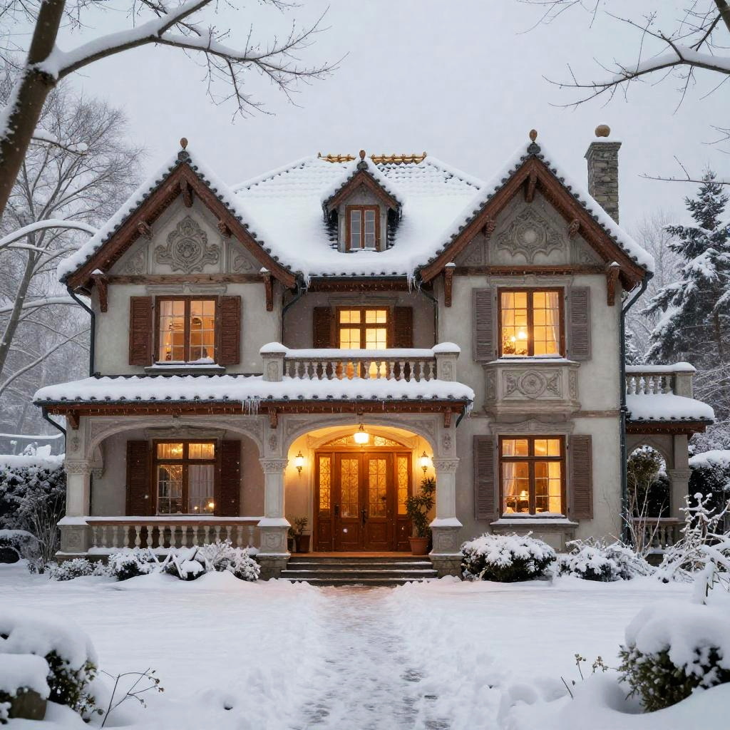 Realistic mansion in a winter setting, snow-covered rooftops and grounds, warm glowing lights from inside, intricate facade details visible under soft snowfall, photorealistic textures of ice and wood, serene and quiet atmosphere