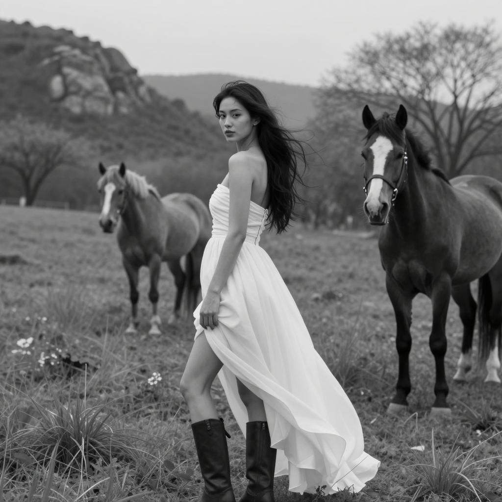 Black and white photograph of a pale-skinned woman with long dark hair, wearing a fur coat, standing beside a dark horse. She holds the horse's bridle with her right hand. The horse's head is turned to the left. She wears dangling earrings. The background is a sandy, foggy landscape. The woman's facial expression is neutral. The fur coat is partially draped over her right arm. The horse's ears are pointed forward.
