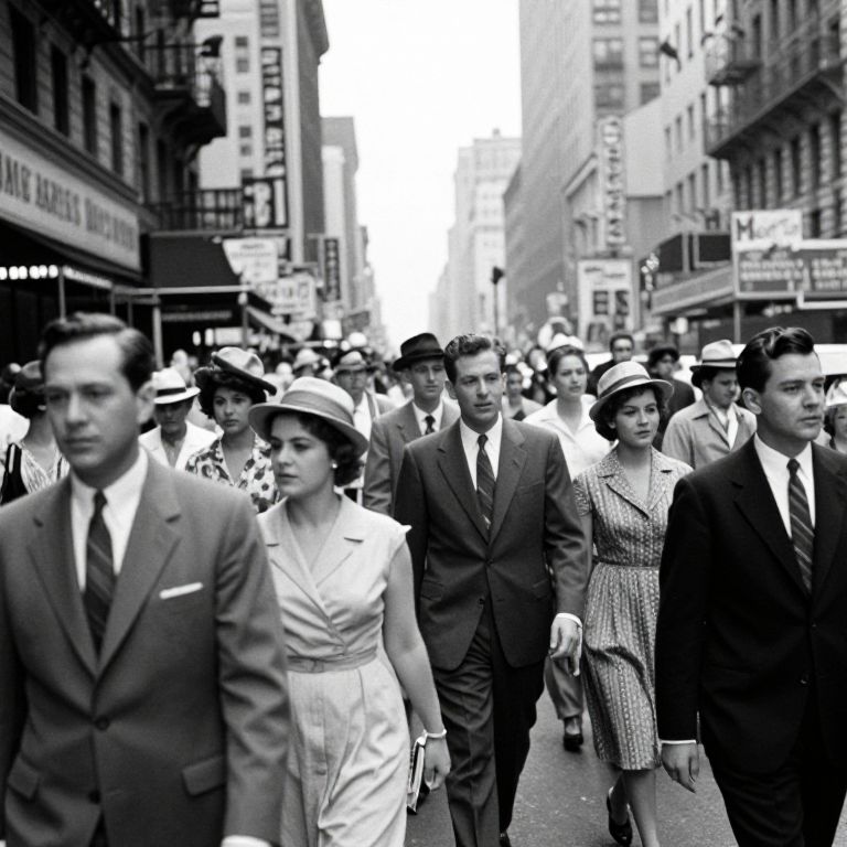 The image captures a bustling 1950s Manhattan street, teeming with a dense crowd of people walking in the same direction. The scene is rendered in black and white, adding a timeless quality to the urban landscape. The individuals, dressed in period-appropriate attire, exhibit a variety of textures and patterns, from crisp suits and ties to casual dresses and hats. The crowd is tightly packed, with people of different ages and genders intermingling, creating a sense of movement and energy. The street itself is flanked by tall buildings, their facades adorned with signs and advertisements, contributing to the busy atmosphere. The perspective is from a low angle, looking up the street, which emphasizes the height of the buildings and the density of the crowd. The overall composition is dynamic, with the people forming a cohesive flow that leads the viewer's eye down the street.